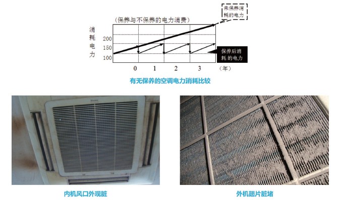 空調運行時空氣中大量塵埃會層層包裹散熱片,并逐步堵塞散熱片之間的微小空隙,影響機器的散熱,此時壓縮機電流增大,運轉時間延長,耗電量顯著增加。